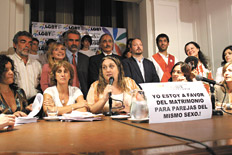 “Este encuentro sirve para mostrar a la sociedad el apoyo y el avance en materia de derechos humanos que hay en el colectivo de diputados, diputadas, legisladores y legisladoras” porteños, que están trabajando para lograr “el reconocimiento a la igualdad jurídica” todavía pendiente. Eso dijo María Rachid poco antes del mediodía de ayer, desde el propio Congreso nacional y escoltada por representantes de casi todas las fuerzas políticas del país; apenas unos minutos antes se había dado a conocer el comunicado del Arzobispado, que mereció una mención breve pero contundente durante el encuentro (ver aparte). La mayoría de los políticos presentes, como en el caso de Agustín Rossi (FpV), comprometió de viva voz el apoyo de su bloque; otros, como sucedió con Adrián Pérez (CC), debieron aclarar que se trataba de un aval dado “a título personal”; algunas ausencias se suplieron con adhesiones y promesas de acompañar los proyectos en el debate, como sucedió con Felipe Solá y Fernando Solanas. La diversidad de nombres y lealtades políticas demostró que la moción de modificar la ley de matrimonio civil está respaldada por un consenso de amplio espectro. Precisamente por ello, Vilma Ibarra, autora de una de las iniciativas y presidenta de la Comisión de Legislación General, expresó su intención de “poder tener dictamen” en marzo. En Argentina “las personas lesbianas, gays, travestis van a poder casarse. Y va a ser este mismo año”, auguró Rachid.