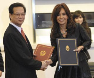 La presidenta Cristina Kirchner recibió ayer al primer ministro de Vietnam, Nguyen Tan Dung, quien se despachó anunciando inversiones por 3 mil millones de dólares junto al grupo del empresario argentino Enrique Pescarmona en emprendimientos para producir energía hidroeléctrica y eólica. Con todo, la Presidenta sostuvo que la relación bilateral “no debe ser simplemente vernos como clientes, porque la Argentina tiene una lógica del comercio internacional. En este mundo global primarán las asociaciones estratégicas entre los países aprovechando sus estrategias y competitividades”. Con los mercados asiáticos cobrando cada vez mayor importancia para las exportaciones argentinas, Cristina Kirchner probablemente visite Vietnam en noviembre en el mismo viaje que incluirá Corea del Sur.