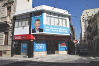 La gigantografía de De Narváez se ve desde una cuadra. El local que abrió el legislador Daniel Amoroso en Bolívar y México está pintado de celeste y blanco, con una franja roja sobre la entrada. Afuera se leen dos consignas: “Hay un país para hacer. Hay un país para ser” y “Francisco de Narváez 2011”. Adentro, lo primero que se ve es un televisor (siempre clavado en América, el canal del que De Narváez es accionista), un mostrador y dos mesas que se asemejan a las de una oficina de turismo. Cinco o seis personas discuten las reuniones de la semana próxima. En las paredes, la decoración remeda las de las oficinas de De Narváez en Las Cañitas: un mural con fotos de “gente común”, entre las que se intercalan las de De Narváez y Amoroso, y frases como “el futuro no viene. Al futuro hay que ir”. O “el corto plazo y el largo plazo comienzan el mismo día”. Las oficinas cuentan con un cuarto de reuniones ejecutivas, un microcine para cincuenta personas y hasta un playroom. Hay señales de que están recién llegados: de fondo, se escucha un taladro; en el piso hay cajas con los aires acondicionados.