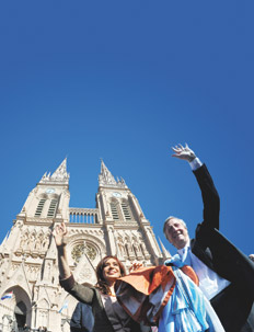 En un día como pedido por catálogo, sin una sola nube sobre el soleado cielo de Luján, Cristina Fernández participó de la más importante de las ceremonias religiosas que se llevaron a cabo en todo el país para festejar el Bicentenario. Acompañada por su marido, Néstor Kirchner el gobernador bonaerense Daniel Scioli, el Gabinete nacional en pleno, una numerosa dotación de diputados y senadores oficialistas y de fuerzas aliadas, sindicalistas, Abuelas y Madres de Plaza de Mayo y personalidades de la cultura, la mandataria escuchó el Tedéum del arzobispo de Mercedes-Luján, Agustín Radrizzani, quien –sin dejar pasar algunas críticas– dio un mensaje conciliador, en el que llamó a “promover una mayor fidelidad a la democracia, ya que es la única que puede garantizar la igualdad y los derechos de todos” y a “avanzar hacia un nuevo proyecto de Nación, que haga posible un justo y solidario desarrollo de la Argentina”. Afuera de la basílica, miles de militantes kirchneristas llegados de todo el país siguieron la ceremonia y luego tuvieron la posibilidad de saludar a la Presidenta, su esposo y algunos funcionarios que se acercaron a la multitud.