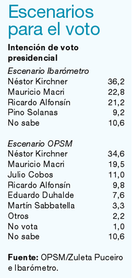 - Capurro: Hay un solo dirigente que ocupa todo el escenario político. Todo se mueve alrededor de él. Y ése es Néstor Kirchner. A favor o en contra, todos se referencian a él. Lleva adelante la agenda electoral en toda su dimensión: en los medios, en la política, en la gestión, en la oposición y en el oficialismo. Y eso se refleja también en el panorama electoral. Hoy hay un ganador claro en la primera vuelta, si las preferencias electorales se mantienen dentro de los parámetros actuales. Lo que está en juego es quién entra en el segundo lugar. Hay dos opciones: el panradicalismo o el peronismo disidente más el PRO. Es una incógnita saber si Alfonsín puede superar el fantasma de la ingobernabilidad, el fracaso de la Alianza, la hiperinflación. Así como es una incógnita saber si Macri puede superar el procesamiento judicial y despejar las sospechas. Y hoy aparece muy poco probable que otro candidato pueda arribar a la segunda vuelta.