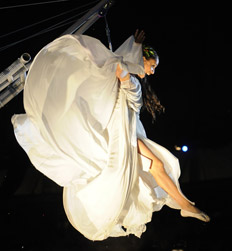 Entre videos que recorrían los hitos de la historia local desde una perspectiva justicialista –con grabaciones de Evita, de Perón y de obreros defendiendo sus derechos a modo de leitmotiv– hicieron su ingreso los actores de la compañía Eleve Danze. Tras colgarse de unos arneses circulares que ganaban altura lentamente, flotaron haciendo piruetas de corte futbolero, ataviados con los colores de Estudiantes y de Gimnasia y Esgrima. De remate, emergieron unos personajes con trajes luminosos, que añadieron matices a una paleta ya de por sí multicolor. Más bombos, más tonos vivaces. El espíritu dionisíaco que sabe movilizar el amplísimo arco en que pivota el peronismo ya estaba a punto caramelo.