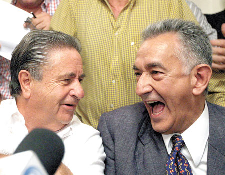 Eduardo Duhalde y Alberto Rodríguez Saá al principio de la interna, cuando todavía sonreían.La interna del Peronismo Federal se diluye en el aire, pero las acusaciones no. El de-sacuerdo entre Alberto Rodríguez Saá y Eduardo Duhalde acerca de si la votación debía realizarse sólo en las capitales provinciales provocó ayer fuertes cruces entre los peronistas disidentes. El puntano ratificó los comicios previstos para hoy en Catamarca, Tucumán y Santiago del Estero, pero el bonaerense insistió en que fueron suspendidos.