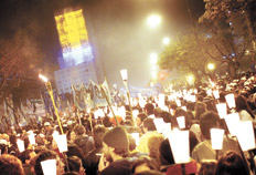 El acto de anoche, masivo, fue ante todo sobrio, prolijo. Hombres, mujeres y niños del conurbano, con banderas de caudillos, sindicatos y agrupaciones, bajaron de colectivos escolares y se mezclaron con otros miles que llegaron de a pie. Un chico rubio de unos cuatro años miró desde abajo y le pidió al cronista que le encienda su antorcha. “Todavía no”, ordenó la madre. Al pie del elefante blanco se escuchó el Discurso del Renunciamiento y se despacharon choripanes. La Juventud Sindical avanzó con Hugo Moyano y Omar Viviani a la cabeza, rodeado de camperas amarillas y negras de peones de taxis. Alguien ordenó “pasan los dirigentes, los demás se quedan”. Los acompañantes del líder de la CGT también acataron.