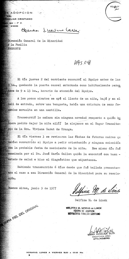 El informe de la hija de Teresita Trotta y Roberto Castelli es anterior, y todavía más insólito. Después del membrete y el destinatario, Linck escribió: “El jueves 2 del corriente (junio de 1977) concurrí al Equipo antes de las 9 hs., quedando la puerta cancel entornada como habitualmente permanece de 9 a 13 hs., horario de atención del Equipo. A los pocos minutos se oye el llanto de un niño, bajé y en el hall de entrada, sobre una banqueta, había una criatura de sexo femenino envuelta en una mantilla. Transcurrió la mañana sin ninguna novedad respecto a quién hubiera podido dejar la niña allí: la alojamos en el Hogar Transitorio de la señora Viviana Garat de Uranga. El día viernes 3 se revisaron las fichas de futuras madres que habían concurrido al equipo a pedir orientación y ninguna coincidía con la probable fecha de nacimiento de la niña”. La revisó un doctor y como habían pasado seis días desde el hallazgo, pasaron un informe a la Dirección del Menor, cuyos integrantes también están bajo sospecha por estos trámites.