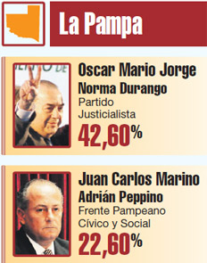 El kirchnerista Oscar Jorge seguirá gobernando La Pampa. El mandatario, que aceptó ir por la reelección luego de que el ex senador Carlos Verna renunciara a su candidatura, tenía al cierre de esta edición un 42,62 por ciento de votos, veinte puntos más que el Frente Pampeano Cívico y Social, la alianza de radicales y socialistas que se presentó con la fórmula encabezada por el senador Juan Carlos Marino, que obtuvo el 22,62 por ciento. Tercero fue el voto en blanco, por el que optaron el 13,39 por ciento de los pampeanos. Jorge obtuvo casi 15 puntos menos de los que consiguió en La Pampa la presidenta Cristina Fernández de Kirchner.
