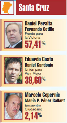 Con apenas el 23 por ciento de las mesas escrutadas, el kirchnerista Daniel Peralta conseguía anoche su reelección como gobernador de Santa Cruz. El mandatario, que compartió fórmula con el intendente de Caleta Olivia, Fernando Cotillo, obtenía al cierre de esta edición el 57,41 por ciento de los votos. En segundo lugar, con un 39,59 por ciento, quedaba el frente Unión para Vivir Mejor, una alianza entre la UCR, la Coalición Cívica, el Partido Socialista, Nuevo Movimiento y el Partido Unidos por Santa Cruz, que postulaba como candidato al radical Eduardo Costa. Mientras Peralta evitaba anoche celebrar por anticipado, algunos radicales aseguraban que la tendencia a su favor podía revertirse.