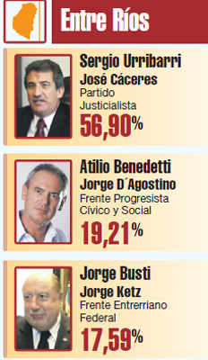 Sergio Urribarri obtuvo con comodidad su reelección como gobernador de Entre Ríos. Encolumnado con el gobierno nacional, con su actual ministro de Desarrollo Social, José Cáceres, como compañero de fórmula, el mandatario consiguió el 56,97 por ciento de los votos (con el 78,9 por ciento de las mesas escrutadas), casi cuarenta puntos por encima del Frente Progresista Cívico y Social que postuló al radical Atilio Benedetti, que obtuvo el 19,44 por ciento. Tercero se ubicó el Frente Entrerriano Federal del ex gobernador Jorge Busti, que no acompañó a ninguna fórmula presidencial, con el 17,4 por ciento de los votos.