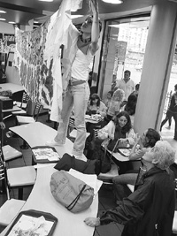Uno de los principales puntos de discusión en la reunión había sido si trabajar en un McDonald’s “implica avalar el criterio de la patronal yanqui o no”. La asamblea se dividió en dos posiciones. “Y es que la mayor parte de nosotros –dice El Palmera– no tiene trabajo o tenemos chance de conseguirlo sólo en esas empresas, o como repositores en los hipermercados, que es más o menos igual”. Finalmente primó la idea de que el escrache no incluiría a los trabajadores, punto que El Muerto se encargó de aclarar con un breve discurso a la clientela del local mientras sus pares pintaban las paredes del mismo.
