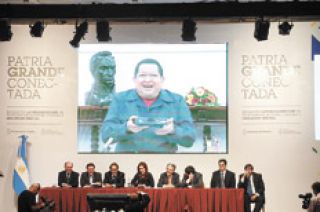 Encabezó un acto por la televisión digital y conversó por videoconferencia con Hugo Chávez. Dijo estar “muy orgullosa” de la decisión de Perú de no permitir que una fragata británica repostara en su puerto y criticó el colonialismo.