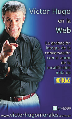 El conductor Víctor Hugo Morales denunció ayer que el diario La Nación censuró un aviso de su página web (ver foto). “La Nación no quiso publicar un aviso, que tiene la responsabilidad de hacer porque tenemos un acuerdo comercial por las notas que yo hago para lanacion.com”, describió Víctor Hugo en su programa de radio. El aviso publicita la página “Víctor Hugo en la web” con el logo de la revista Noticias –publicación con la que viene manteniendo una disputa pública– y las frases “la mentira llevada al límite de la moral más bajo”, “las 24 mentiras de la nota de Noticias, el relator del relato” y “la grabación íntegra de la conversación con el autor de la incalificable nota de Noticias”. “Este es el aviso común y corriente que tenía que publicar La Nación. Se negaron, porque dicen que es una solicitada. ¿Era una solicita entonces el aviso de Noticias con mi tapa que La Nación publicó sin ningún tipo de problemas? ¿Era una solicitada esa tapa en la que vergonzosa y calumniosamente la revista Noticias hablaba de este periodista? Este es un caso clavadito de censura”, denunció ayer Morales.