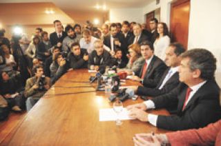 A pesar de todo, fue el mismo Scioli quien cumplió con informarle a la prensa de las disposiciones adoptadas por el Consejo. Lo hizo sin micrófonos, en el primer piso del edificio de Matheu, forzando la voz para que se lo escuchara por sobre los bombos de militantes de Mario Ishii que se habían convocado a la puerta. El gobernador se presentó ladeado por Capitanich, Urribarri, la presidenta provisional del Senado, Beatriz Rojkés (todos ellos vicepresidentes del PJ nacional), y la presidenta del PJ bonaerense, Cristina Alvarez Rodríguez. “No se habló de candidaturas, sino del compromiso que se vio reflejado en el documento final –sostuvo el titular del partido–. Todos coincidimos en el rumbo del país, por eso el documento es un respaldo al liderazgo de la Presidenta; todos reconocemos que la jefatura del partido la lleva adelante Cristina.”
