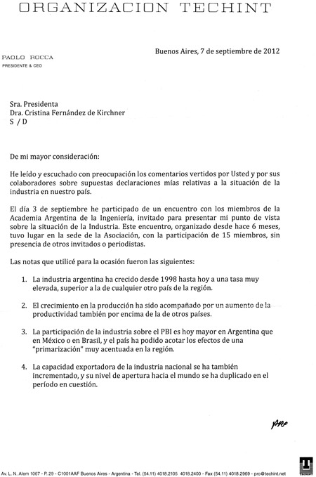 “He leído y escuchado con preocupación los comentarios vertidos por Usted y sus colaboradores sobre supuestas declaraciones mías relativas a la situación de la industria en nuestro país”, comienza la nota del CEO de Techint a Cristina. Sin citarlas textualmente, Paolo Rocca rechaza las declaraciones que le fueron atribuidas, describiéndole a la Presidenta de la Nación “las notas” que utilizó durante su exposición del lunes pasado “en la Academia Argentina de Ingeniería, con la participación de 15 miembros, sin presencia de otros invitados o periodistas”. Según esas “notas”, lo que Rocca planteó en ese encuentro fue lo siguiente:
