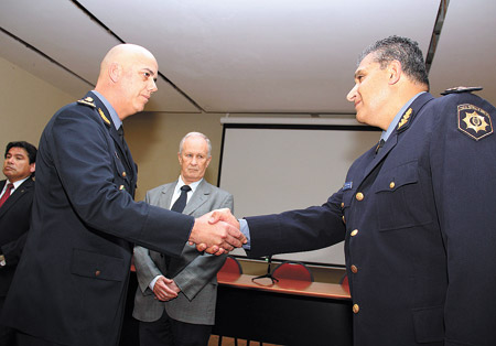 Cristian Sola (izquierda) asumió ayer como nuevo jefe de la Policía santafesina.El ex jefe de la policía santafesina, Hugo Tognoli, estaba –al cierre de esta edición– inubicable por la Justicia, luego de que el juez federal Carlos Vera Barros ordenara, a pedido de la fiscal Liliana Bettiolo, su detención y no fuera hallado en su domicilio de la capital provincial por la Policía de Seguridad Aeroportuaria (PSA). La fuerza tiene la orden de trasladarlo a Rosario en la mañana de hoy para su declaración indagatoria. Sin embargo, Vera Barros tuvo un gesto con el ex jefe policial ya que libró el oficio de detención también a la Policía santafesina, con lo cual le dio aviso inmediato a Tognoli de que era buscado. La Justicia le imputa el incumplimiento de deberes de funcionario público y la violación de la ley 23.737 de estupefacientes, entre otros delitos.