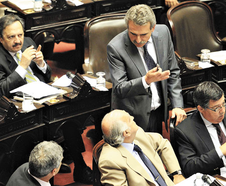 El oficialista Agustín Rossi y el radical Ricardo Gil Lavedra ayer en Diputados.Con 131 votos de los diputados kirchneristas y sus aliados, con 55 en contra y 18 abstenciones, la Cámara de Diputados expresó su rechazo a la denuncia penal presentada por el Grupo Clarín “contra periodistas, funcionarios, legisladores y organizaciones políticas” a los que acusó de “incitación a la violencia” y “coacción agravada”. Las bancadas opositoras repudiaron la denuncia, pero no acompañaron el proyecto de resolución; en cambio, valoraron positivamente la “autocrítica” del Grupo Clarín y prefirieron cargar contra el Gobierno. El jefe del bloque oficialista, Agustín Rossi, cuestionó que los diputados de la oposición “sólo criticaron la denuncia a los periodistas, que es lo único que rectificó Clarín, pero no la denuncia si se trata de militantes políticos, legisladores y funcionarios que piensan distinto”.