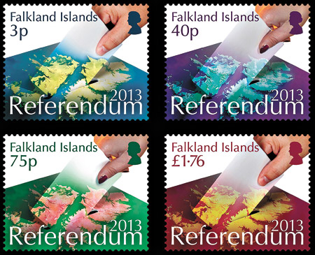 Las estampillas conmemorativas del referéndum que se realizará en las islas Malvinas. El gobierno argentino volvió a rechazar la validez de la consulta que Gran Bretaña llevará a cabo mañana y el lunes en las islas Malvinas para que los habitantes del archipiélago dejen constancia de si quieren o no seguir bajo la órbita de Londres. “El Reino Unido carece de derecho alguno a pretender alterar el estatuto jurídico de esos territorios, aun con el disfraz del hipotético referéndum”, sostiene un comunicado difundido ayer por la Cancillería. Por su parte, el Premio Nobel de la Paz Adolfo Pérez Esquivel envió una carta al primer ministro inglés, David Cameron, manifestando su oposición a la medida que, sostuvo, “no tiene legitimidad alguna”. La semana próxima, el Senado argentino tratará un proyecto de resolución para repudiar la iniciativa.
