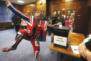 Entre las imágenes de casas embanderadas, cochecitos de bebés con los colores británicos y remeras con consignas en favor de la soberanía británica sobre las islas, la postal más llamativa fue la de un malvinense que fue a votar vestido de pies a cabeza con la bandera inglesa, estampada incluso en sus zapatos.