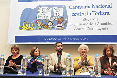 Bajo el cartel, Stella Maris Martínez y Estela de Carlotto, entre otros, lanzaron la campaña contra el flagelo de la tortura.Si se trata de simbolismos, el lanzamiento de la Campaña Nacional contra la Tortura en el marco del Bicentenario de la Asamblea del Año XIII fue un lugar privilegiado. La ex ESMA, emblema de la tortura y la desaparición de personas durante la dictadura, pero que siguió siéndolo, intocable, durante 20 años más, hasta 2004, ayer fue el escenario para proclamar el lanzamiento de una campaña que aglutinó un abanico de instituciones, organizaciones sociales y representantes pocas veces visto: la CNCT, convocada por la Defensoría General de la Nación, tuvo nada menos que 19 oradores. La Campaña, durante un año, realizará difusión de avisos publicitarios, acciones de capacitación para defensores oficiales y educativas (ya se inició con una charla en el Carlos Pellegrini) y concentrará sus esfuerzos en el próximo Congreso Internacional contra la Tortura, que se realizará en junio en Buenos Aires. Además se propone capacitar a personal y aspirantes de las fuerzas federales de seguridad, para lo que cuenta con el apoyo del Ministerio de Seguridad.