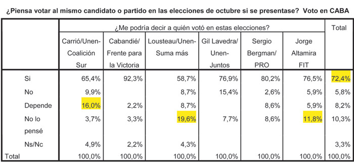 En la Capital, el 92,3 por ciento de los votantes del FpV, el 80,2 de aquellos que se inclinaron por el PRO y el 76,5 de quienes lo hicieron por el Frente de Izquierda son los que más claramente tienen definido su voto. Son votantes convencidos y difícilmente cambien en la elección del 27 de octubre. Por el contrario, el 19,6 por ciento de quienes votaron a Martín Lousteau (Unen) dijeron no haber pensado todavía a quién respaldarán en octubre y el 16 por ciento de quienes apoyaron a Elisa Carrió (Unen) manifestaron que su sufragio en las elecciones legislativas “depende” de otras consideraciones.