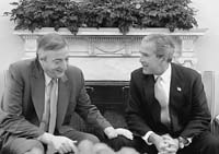 La reunión duró lo habitual en estos casos, poco más de media hora. Exactamente 35 minutos según los cálculos de la prensa, 40 según los más elásticos cronómetros oficiales. Para quienes esperaban bajo el tórrido sol que bañaba los jardines de la Casa Blanca, Bush fue invisible. Recibió y despidió a los argentinos dentro de la muy televisiva The West Wing, la sala oeste que los presidentes norteamericanos utilizan como lugar de trabajo y, en sus ratos libres, para algunas otras cosillas.