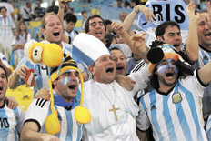 “Yo soy brasileño, con mucho orgullo”, cantan los brasileños y la respuesta propia de aprendices de barrabrava no se hace esperar: “Es para vos, es para vos, brasuca puto... y todo lo que ya se sabe que sigue. Después improvisan cantos más divertidos que terminan asegurando que “Maradona es más grande que Pelé”. Están todos desperdigados en las tribunas, aunque un grupo de argentinos en una de las cabeceras parece estar a cargo de la batuta y empieza la mayoría de los cantos. Que “Vamo’ a salir campeones otra vez, como en el ‘86...”, que “Vení vení, cantá conmigo...”, que “de la mano de Lio Messi...”, que “el que no salta es un inglés...”.
