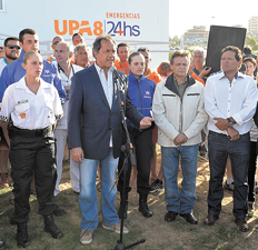 Un puñado de 50 o 60 personas, entre dirigentes, funcionarios, periodistas y empleados con camperas y gorros naranjas esperaban al gobernador a un costado de la Unidad de Pronta Atención (UPA) 8. Según le relató a Scioli el director médico de este centro de salud de baja complejidad, reciben en promedio 120 consultas por día y llevan más de dos mil en total desde su inauguración, el 5 de enero. El secretario de los balnearios privados de Punta Mogotes, Juan Martínez, le agradece al gobernador por el aporte del material interno del centro de salud sin dejar de señalar que la iniciativa y la reforma del complejo comenzó en 2002, por iniciativa privada. En un costado aparecen los dos nuevos patrulleros policiales y tres personas vestidas con el uniforme. “Años de trabajo para poder llegar a este momento, firmar acuerdos con las universidades. Reformas administrativas, fiscales, económicas. No es una cuestión de voluntad, es un trabajo de selección previa. Ha sido tres veces mayor el número de aspirantes que los finalmente seleccionados. Lo que significa su equipamiento, los nuevos móviles, uniformes”, agregó Scioli en referencia a la creación de las policías locales y la incorporación de 10 mil oficiales.