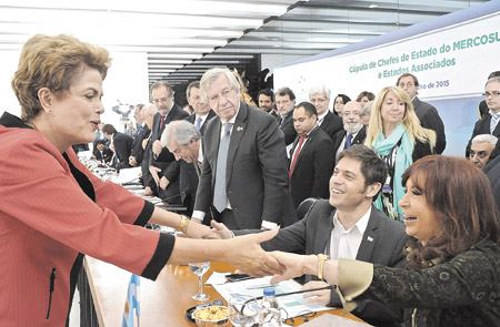 Dilma Rousseff saluda a Cristina Kirchner y a Axel Kicillof antes del inicio de la Cumbre del Mercosur, en Brasilia.El presidente Evo Morales se puso de pie. El resto de los mandatarios que integran el Mercosur lo aplaudió. Fue la forma de celebrar el ingreso del Estado Plurinacional de Bolivia como miembro pleno del bloque. “Es un fracaso para quienes pronosticaron con profecías que el Mercosur no iba a servir. Estoy convencida de que la unidad de América del Sur va a poder sostener estos años de crecimiento económico y de inclusión social sin precedentes que ha tenido la región”, dijo la presidenta Cristina Fernández de Kirchner durante su discurso en la 48ª cumbre del bloque, que se realizó ayer en Brasilia. Durante el encuentro, los presidentes firmaron un documento en el que respaldaron a Argentina en sus principales reclamos internacionales: la soberanía de las islas Malvinas, el rechazo al accionar de los fondos buitre y la necesidad de contar con una herramienta global que regule el pago y la reestructuración de las deudas soberanas, sobre la que se está trabajando en Naciones Unidas por impulso del gobierno argentino.