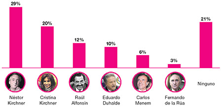 Néstor Kirchner, Cristina Fernández de Kirchner y Raúl Alfonsín son, en ese orden, los tres presidentes de la democracia más valorados por los ciudadanos argentinos. Son, además, los únicos que tienen más opiniones positivas que negativas sobre su mandato. En la otra punta figuran Eduardo Duhalde, Carlos Menem y el peor, Fernando de la Rúa, como los presidentes que tienen más opiniones negativas que positivas sobre su gestión. Néstor Kirchner es quien tiene mejor performance en economía y en defensa de los intereses del país, pero seguido en ambos rubros muy de cerca por su esposa y sucesora. La actual presidenta es la que ranquea mejor en el rubro defensa de los humildes mientras que Alfonsín lidera claramente en materia de honestidad.