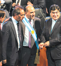 El candidato a presidente por el Frente para la Victoria, Daniel Scioli, llegó ayer por la mañana a San Miguel de Tucumán, para acompañar al gobernador electo Juan Manzur y relanzar su campaña para el ballottage. “Felicitaciones al flamante gobernador y en especial al pueblo tucumano: nos dieron la victoria en las PASO, le dieron la victoria a Juan Manzur en la gobernación, y ahora les pido nuevamente su apoyo para la victoria final el 22 de noviembre, para que juntos encaremos esta agenda de desarrollo”, dijo Scioli desde el balcón del teatro San Martín cuando terminó el acto de asunción de Manzur como gobernador electo.