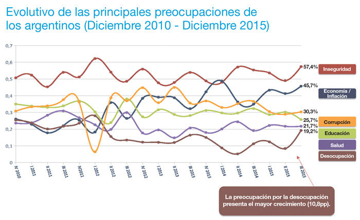 “Hay que mirar las preocupaciones como un contexto en el que se desarrollan las cosas –explica Bacman–. No hay nada nuevo con respecto a la inseguridad y no es fácil un cambio en tres semanas. Seis de cada diez personas dicen que sigue siendo su principal desvelo. A continuación se enciende el primer semáforo amarillo: la preocupación por la economía argentina en su conjunto. Eso trepa al 45 por ciento. Otro dato de contexto que no debe tomarse a la ligera es la preocupación por la desocupación. Esto se instala siempre en el imaginario colectivo de los argentinos cuando la marcha de la economía preanuncia tiempos con posibilidad de turbulencias. Al día de hoy, la preocupación por el desempleo subió al doble, desde el diez por ciento al veinte”.