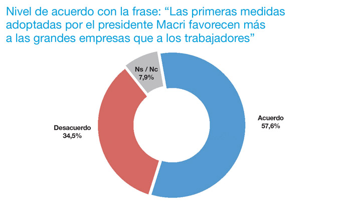 Respecto de las expectativas de cambio, Bacman responde: “para la mayor parte, casi el 68 por ciento, Macri demostró en estos primeros días de gestión ‘vocación por el diálogo y el consenso’. ¿Eso alcanza? Seguramente no, pero por el momento les está rindiendo suculentos dividendos políticos. Sin embargo, por debajo de lo manifiesto navega inexorable lo subyacente. Cuando se pregunta si las medidas económicas que tomó la actual gestión favorecen más a las grandes empresas que a los trabajadores, la respuesta es extremadamente contundente. Ya el 57 por ciento expresa que está de acuerdo con esa frase, es decir que las medidas favorecen a los que tienen más poder económico. No queda duda que, para Macri, el riesgo está presente”.