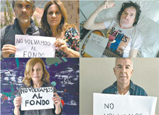 Charly García se permitió una licencia y pone en su cartel “Nos siguen pegando abajo”. El futbolista Gustavo Bou también mandó una foto con “No volvamos al fondo”, pero después dijo que lo hizo sin saber de qué se trataba. “Pensé que era para los chicos que tienen problemas con la droga”, aseguró cuando el video fue replicado por las redes. Los actores hicieron una segunda versión, de la que sacaron la foto de Bou, y aprovecharon para agregar a Fito Páez, que se había demorado en mandar la suya.