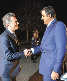 Por la noche, Macri se vio con el emir de Qatar en Olivos, donde encabezaron en acto de firma de memorandos de entendimiento en materia de cooperación y de consulta que suscribieron los cancilleres Susana Malcorra y el jeque Mohammed bin Abdulrahman. También participaron el jefe de Gabinete, Marcos Peña, y el ministro de Hacienda, Alfonso Prat-Gay. Qatar es una de las principales reservas mundiales de gas y al Gobierno le urge intensificar el comercio bilateral.