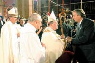 Tras un paseo en caravana por las calles, donde fue vivado por muchas personas con banderitas argentinas, bombos y guitarras y escenarios improvisados para bailar chacarera, Kirchner ingresó en la Basílica. Se sentó en primera fila en un sillón de terciopelo rojo, con reclinatorio del mismo color. Lo flanqueaban su esposa, Cristina Kirchner, y el gobernador radical, Gerardo Zamora, más circunspecto que de costumbre (lo que ya es mucho). Atrás del altar esperaba Maccarone, con el obispo auxiliar y los curas y seminaristas vestidos de blanco. Enfrente, los funcionarios, de negro y gris. La escena reproducía una costumbre antiquísima: el poder civil, profano y transitorio, celebrando su autoridad ante el poder religioso, que exhibía los símbolos de la permanencia.