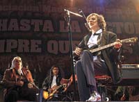 Entre su participación y los invitados se escucharon agradecimientos por las adhesiones a las Fuerzas Armadas Revolucionarias de Colombia (FARC) y a Fidel Castro. En ese clima, entró Charly García con aquel “pero si insisto” revolucionario que al filo de la medianoche iluminó el escenario. “Por supuesto que vamos a portarnos muy bien”, dijo en medio del concierto, sobrio, lacónico, de camisa blanca, corbata a rayas y dueño de una irreconocible paciencia. En ningún momento se quejó de los problemas del sonido. Tocó “Trasformación”, “Rezo por vos”, “Parte de la religión” y “Demoliendo hoteles”, entre otros, pero en ningún otro escenario probablemente sus dinosaurios se hubiesen escuchado mejor. “Los que están en el aire –dijo– pueden desaparecer en el aire; los que están en la calle pueden desaparecer, en la calle; los amigos del barrio pueden desaparecer; pero los dinosaurios van a desaparecer.”