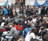 A las 9, una columna de estudiantes del Pellegrini, junto a un grupo de docentes, no docentes y también padres, se concentró frente al rectorado, para impedir que el consejo ratificara la designación del contador Viegas, que desde fines de mayo intenta asumir como autoridad del colegio. Delante de la entrada del edificio ubicado en Viamonte 430 se podían ver los bombos y oír los gritos de los casi 200 adolescentes que cantaban: “Viegas no va a entrar”. Acompañaban banderas y dirigentes de la FUBA y de los centros de estudiantes de las facultades de Ingeniería, Psicología, Filosofía y Letras, Veterinarias, Ciencias Sociales y Arquitectura.