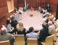Moyano llegó a la Casa Rosada con una numerosa delegación de la CGT. En la Sala de Situación, el camionero fue recibido con un beso por Cristina Fernández de Kirchner, que saludó uno a uno a los dirigentes sindicales. Ya sentados a la mesa, y frente a los flashes fotográficos y las cámaras de televisión que registraban el encuentro, el líder de la central obrera le entregó a la Presidenta un petitorio con una lista de reclamos. CFK –flanqueada por el jefe de Gabinete, Alberto Fernández, y el ministro de Trabajo, Carlos Tomada– lo miró, sonrió y lo puso sobre la mesa para empezar la reunión.