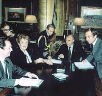 La mención a la televisión no era de importancia en la causa, pero resultó que Ostuni, Cernusco y Tassano Eckart se empeñaron en avalar la versión del ex presidente con sus testimonios. Y ocurrió que fue citado a declarar Víctor Hugo Bu-ggé, fotógrafo de la Presidencia de la Nación desde 1978, y no sólo aseguró que durante la gestión de De la Rúa hubo televisor en el despacho presidencial, sino que aportó las fotos correspondientes al período febrero/abril de 2000. Allí se puede apreciar el aparato de la disputa. Lo mismo sucede con la foto de archivo que ilustra esta nota, que corresponde a una audiencia del entonces gobernador santafesino Carlos Reutemann, celebrada el 12 de abril de 2000, poco después de la reunión de Pontaquarto y los senadores y mucho antes del atentado contra las Torres Gemelas, cuando, según De la Rúa y sus ex asistentes, se instaló la tele en su despacho.