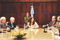 Otro buen tramo de la reunión se utilizó para analizar como funcionaría el Consejo Económico y Social que surgiría del pacto social. Será un órgano permanente presidido por el Ejecutivo y con dos vicepresidentes, uno elegido por el conjunto de las cámaras patronales y otro en representación del sindicalismo. Cristina recibirá hoy a Adeba, la cámara de banqueros nacionales, y para mañana tiene previsto un encuentro con la Cámara de la Construcción. Si no se firma el Acuerdo del Bicentenario el 25 de mayo, es posible que cuanto menos los empresarios suscriban un documento de apoyo a la política económica, al que los ruralistas podrían sumarse el día que arreglen su situación con el Ejecutivo.