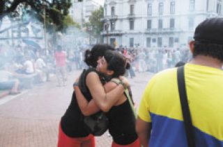 - En la esquina de Piedras y Avenida de Mayo, tres personajes ostensiblemente ajenos a la marcha ofrecían abrazos gratis. “¿Cómo les está yendo?”, preguntó Página/12. “Con la intelectualidad de izquierda mal, pero la gente que viene atrás se la banca”, dijo uno. Culposo, se definió enseguida como un ex intelectual de izquierda, “costumbre que dejé para volverme emotivo”. Los abrazos gratis son una propuesta que nació en Sydney y se difundió por Internet. “Se usa en todo el mundo”, aseguró el entrevistado.