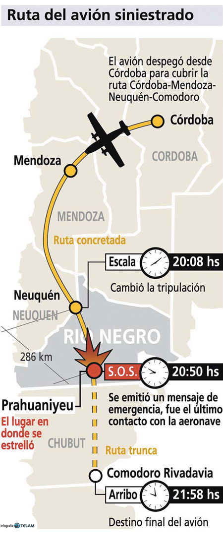 La aeronave “parecía como si estuviera aterrizando y luego, cuando intentaba levantar nuevamente vuelo, se escuchó una violenta explosión”, contó Raúl Goycoechea, un habitante de Los Menucos que al momento del accidente aéreo manejaba su auto por una ruta cercana. En principio, recordó, intentó llegar al lugar del accidente, “pero al darme cuenta de que no podía acercarme por la oscuridad, fui hasta Los Menucos y avisé a los bomberos y a la policía que enseguida partieron al lugar”.