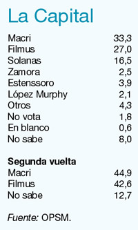 A exactamente un mes de los comicios, Mauricio Macri encabeza la intención a jefe de Gobierno porteño. Daniel Filmus sería su contrincante en la segunda vuelta y en ese ballottage la diferencia es muy exigua, apenas dos puntos. Según la mayoría de los sondeos, Fernando “Pino” Solanas se está quedando relegado y a más de diez puntos de Macri y Filmus. Las conclusiones surgen de una encuesta realizada por Opinión Pública Servicios y Mercados (OPSM), la consultora que encabeza Enrique Zuleta Puceiro. Fueron relevadas 600 personas de toda la ciudad, respetándose las proporciones por edad, sexo y distribución barrial.