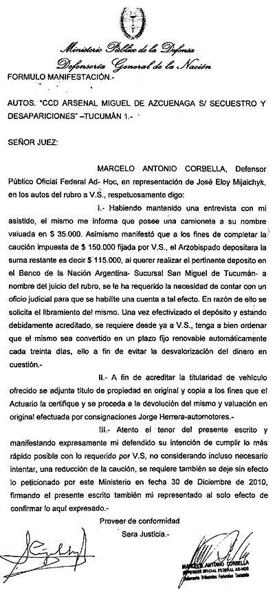 En una presentación hecha ante el juzgado (ver imagen aparte), el abogado de Mijalchyk indica que para llegar al total del dinero de la fianza que le impuso el juzgado de 150 mil pesos, el cura ofrecía una camioneta que estaba a su nombre, valuada en 35 mil pesos, y el resto del monto lo iba a poner el Arzobispado. El 20 de enero de 2011 se terminó todo el trámite con la orden de depósito al Banco Nación. Por entonces todavía no se había producido el cambio de arzobispos en la cabeza de la Iglesia tucumana. Después de doce años seguía en su puesto el arzobispo Luis Héctor Villalba, que saltó a la fama en diciembre de 2002 cuando, en medio de la crisis y los problemas de desnutrición de su provincia, usó una de las homilías para oponerse a la candidatura de Alperovich. En julio del año pasado, cuando se despedía de su comunidad durante el Tedéum, habló por última vez y habló de la memoria: “Conmemorar es recordar nuestro origen, los hechos. Debemos tener memoria histórica sin distorsionarla, sin ideologizarla. Debemos ponernos ante nuestra verdad histórica”.