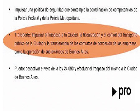 El legislador Aníbal Ibarra difundió por las redes sociales una plataforma del PRO de la campaña de 2011 en la que los macristas reclamaban el traspaso del subte y los colectivos. El documento propone “impulsar el traspaso a la ciudad, fiscalización y control del transporte público de la ciudad y el contrato de concesión de las empresas como la operación del subterráneo” para “poder implementar una política integral de tránsito y transporte”. “Ahora protestan, pero en su plataforma proponían solicitar el traspaso”, se divirtió Ibarra.