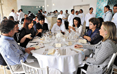 La Presidenta compartió la mesa con el anfitrión colombiano, con Evo Morales, Dilma Rousseff y Hillary Clinton.