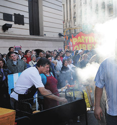 - Al chori, al chori. La Plaza, desde temprano, se vistió con banderas de los distintos sindicatos. Había pasacalles con el rostro de Moyano y leyendas de “Moyano conducción”. La primera columna era de Olavarría (“vinimos para colgar los trapos”, le contaron a un periodista madrugador). Ya a las 10 de la mañana llegaban las primeras columnas, al son de los bombos y mientras el olor de los choris recién tirados a las brasas lo inundaba todo. Costaban 15 pesos. Cerca de uno de los puestos, un hombre de traje y corbata, pelito corto y Black Berry en mano sacaba fotos de la manifestación. ¿Venía a protestar? “No, vengo a comerme un chori”, esquivó a este diario.