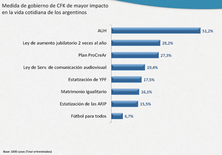 Era cantado que la ley de actualización jubilatoria y de la Asignación Universal por Hijo iban a estar entre las más valoradas: se trata de medidas sociales que se centran en los dos sectores más vulnerables de la sociedad, los mayores y los menores. Pero en la escala realizada por el CEOP llama la atención la fuerte aceptación del Plan Pro.Cre.Ar, que está en pleno desarrollo en la actualidad y la alta valoración de la Ley de Servicios de Comunicación Audiovisual: el 56 por ciento de los encuestados dicen que están de acuerdo y cuando al entrevistado se le pide que opte entre las medidas más importantes tomadas por CFK, hay uno de cada cinco que elige la ley de medios como la de mayor impacto.