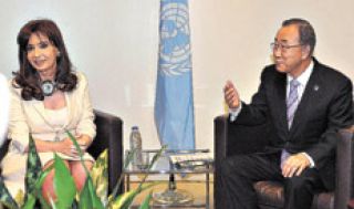 La primera actividad de la Presidenta en Nueva York fue la entrevista que tuvo ayer al mediodía con el secretario general de Naciones Unidas, Ban Ki-moon. Cristina Fernández de Kirchner no fue sola. Estaban el canciller Héctor Timerman, el secretario de Comunicación Pública, Alfredo Scoccimarro, y la embajadora ante la ONU, Marita Perceval. Pero también el teólogo José María del Corral, coordinador del proyecto del papa Francisco de las Scholas Ocurrentes, el diputado de La Cámpora Eduardo “Wado” de Pedro y la nieta recuperada y militante de Kolina Victoria Montenegro. Durante el encuentro, Ban-Ki-moon dijo que pondría los recursos técnicos del organismo internacional a trabajar en la redacción del marco regulatorio multilateral sobre deudas soberanas que aprobó la Asamblea General el 9 de septiembre y señaló que la problemática de la juventud era una de sus prioridades.