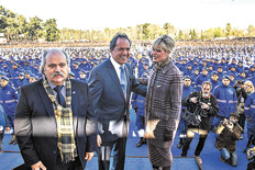 El gobernador bonaerense Daniel Scioli tomó ayer juramento de lealtad a la bandera a 18 mil policías locales. Acompañado por su esposa, Karina Rabolini, el precandidato presidencial del Frente para la Victoria llamó a avanzar “afianzando todo lo que se hizo, haciendo lo que falta, siempre a favor, construyendo sobre lo construido”. “Soy el primero en saber todo lo que falta. También faltaban 45 mil policías nuevos y mejor entrenados, en universidades públicas. Faltaba ayudar a los que más necesitan, con políticas de inclusión social, culturales y deportivas. Faltaba una provincia con su presupuesto equilibrado y faltaba desendeudarse”, agregó.