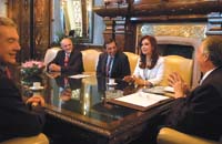 Néstor Kirchner y Cristina Fernández comenzaron a compartir su agenda de actividades, una costumbre que seguramente se extenderá hasta el lunes del traspaso presidencial. A las 11, Kirchner y la presidenta electa acordaron con el gobernador electo de Neuquén, Jorge Sapag, trabajar juntos “en un federalismo de coordinación, integrando acciones” entre Nación y provincia, según contó Sapag. Luego, juntos también recibieron a las autoridades de la automotriz Peugeot-Citroën en Argentina (foto). En la reunión participó el ahora ex presidente de la firma, Luis Ureta Sáenz Peña, designado embajador argentino en Francia. Por último, Néstor y Cristina Kirchner mantuvieron un encuentro con el consejero y director de América del grupo Santander, Francisco Luzón. Recién cuando le tocó el momento de la entrevista televisiva que tenía pautada para ayer a la tarde, el Presidente se separó de su esposa.